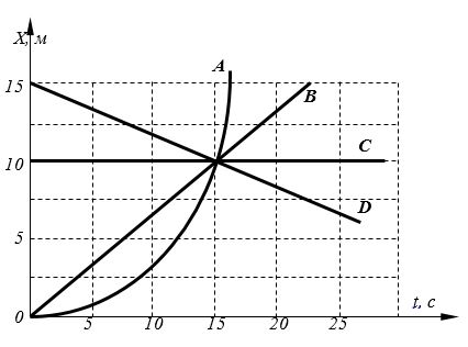 На рисунке изображены графики зависимости координаты от времени для четырех автомобилей. Наименьший путь за первые 15 с движения прошел автомобиль: