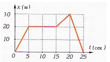 На рисунке показан график зависимости координаты пешехода от времени. Чему равна скорость пешехода (м/с) в интервале от 15 до 20 с. Ответ записать без единицы измерения.
