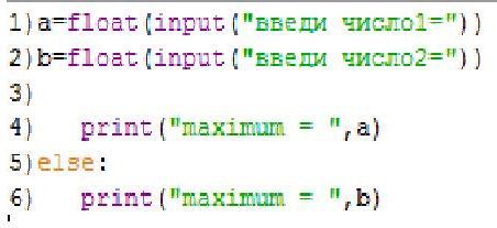 Рассмотри блок-схему задачи нахождения наибольшего из двух чисел. Допиши пропущенную строку 3) в коде на Python.