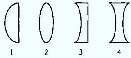 На рисунке представлены поперечные сечения четырех стеклянных линз. Какие из них являются собирающими?