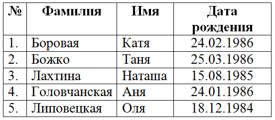 В результате фильтрации таблицы БД по полю «Дата» с шаблоном «<24.02.1986» будут выведены записи: