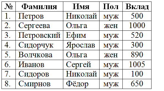 Какие записи удовлетворяют условию поиска вкладчиков (Пол=жен)ИЛИ((Вклад>500)ИЛИ(Вклад=500))И(Фамилия=П*):