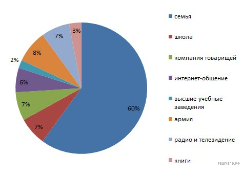 Перед вами данныек соц. опроса в котором участвовали 1600 юношей и девушек страны Y. Им задавали вопрос: «Что в наши дни формирует основы жизненного опыта молодёжи?» Полученные результаты (в % от числа опрошенных) представлены в виде диаграммыНайдите в приведённом списке выводы, которые можно сделать на основе диаграммы, и запишите цифры, под которыми они указаны.