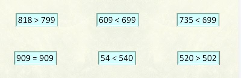 - Если в числах количество сотен и десятков одинаковое, сравниваем единицы.