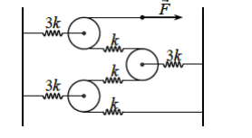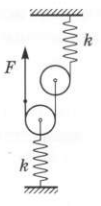 Изначально нить, перекинутая через блок, не натянута. К свободному концу нити прикладывают силу F. Определите эквивалентный коэффициент жесткости системы. Жесткости пружин известны и указаны на рисунке