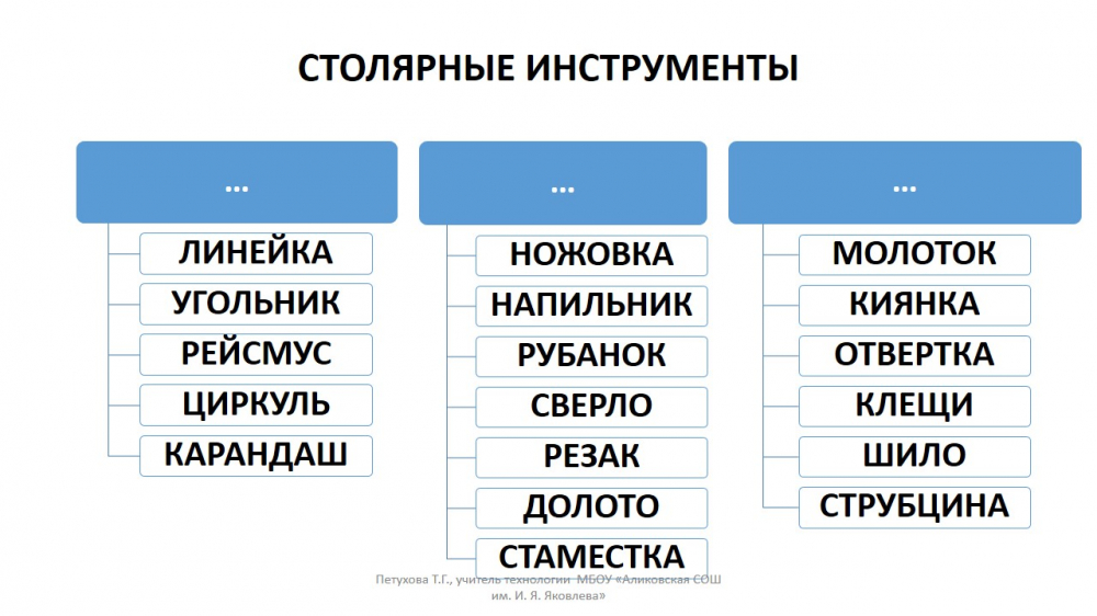 Дополните недостающие слова в группах столярных инструментов последовательно