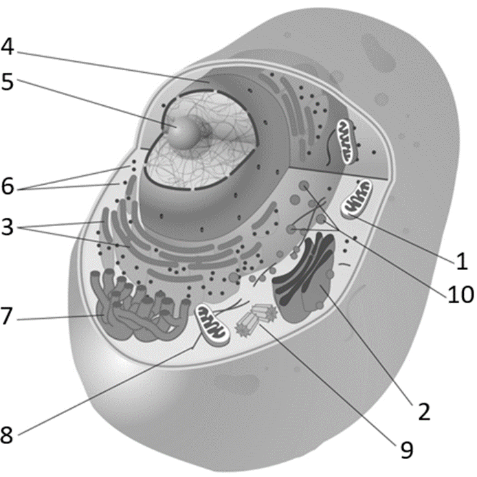 Установите соответствие между характеристиками и клеточными органоидами, отмеченными на рисунке цифрами 1, 2, 3