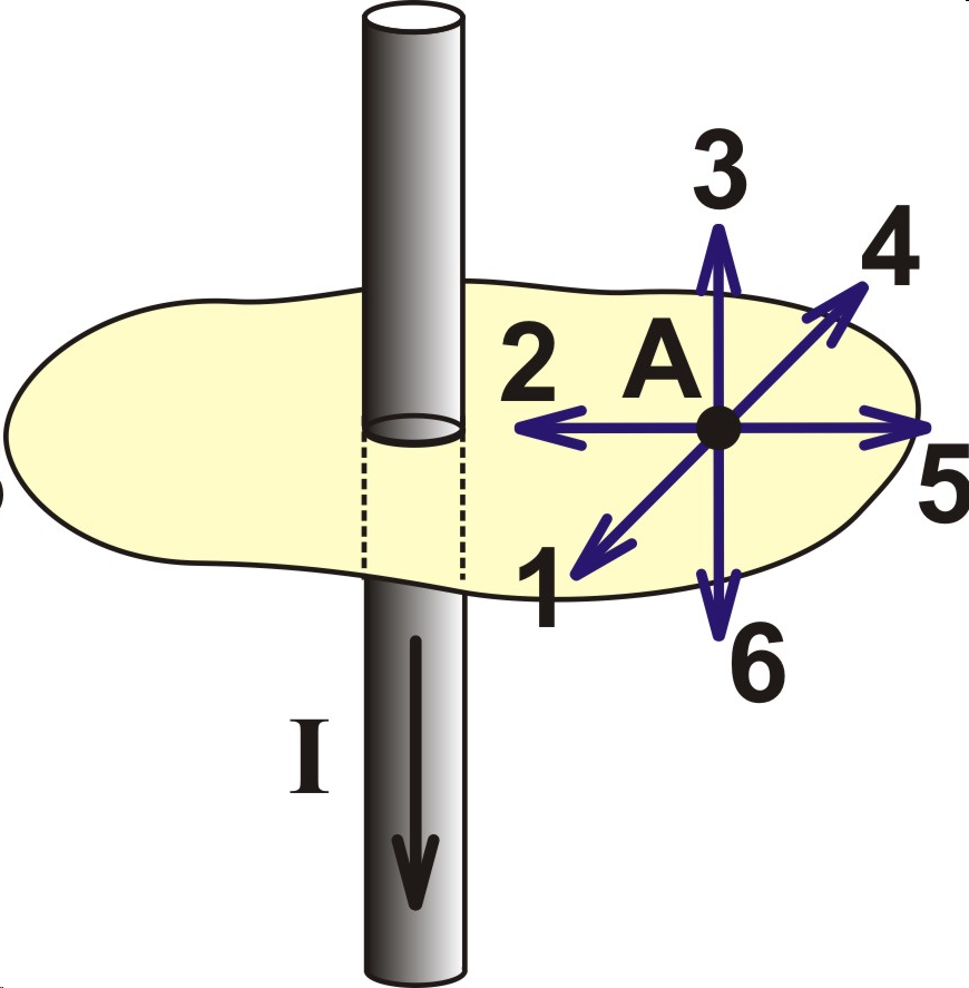 Укажите номер стрелки, совпадающей с направлением вектора В индукции магнитного поля, созданного проводником с током, в точке A (см.рис)