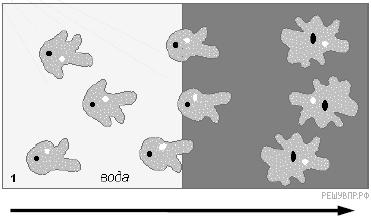 В опыте экспериментатор осветил часть капли с находящимися в ней амёбами. Через непродолжительное время простейшие стали активно двигаться в одном направлении.