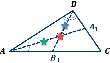 Укажите место, где биссектриса угла С пересечёт биссектрисы углов А и В.
