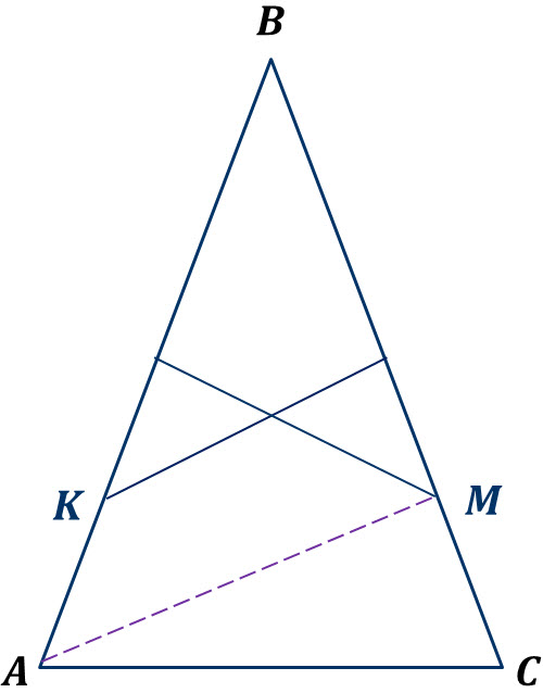 Дан равнобедренный треугольник АВС (АВ = ВС). Серединный перпендикуляр к стороне АВ пересекает сторону ВС в точке М, серединный перпендикуляр к стороне ВС пересекает сторону АВ в точке К. Тогда