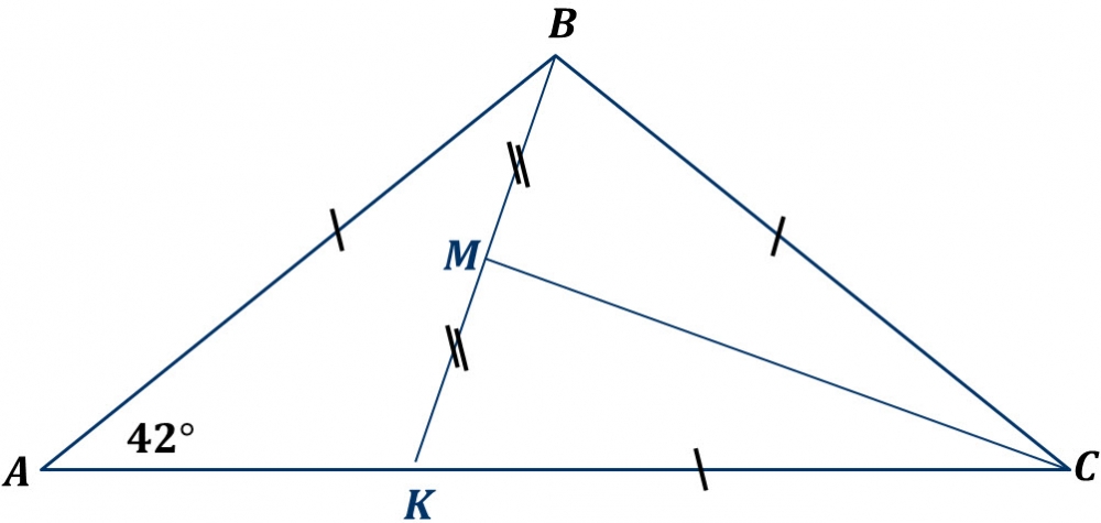 В треугольнике АВС, проведен серединный перпендикуляр СМ к ВК. Угол А равен 42о. Найдите угол МСК. В ответ запишите только число. Например: 7