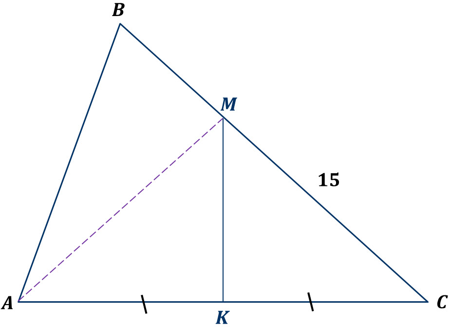 В треугольнике АВС МК - серединный перпендикуляр к стороне АС. Найдите длину АМ, если МС = 15 см. В ответ запишите только число. Например: 7