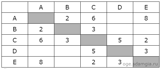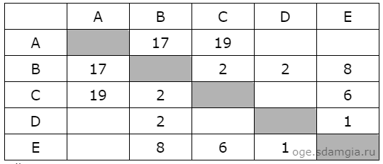 Между населенными пунктами A, B, C, D, E построены дороги, протяженность которых (в километрах) приведена в таблице.