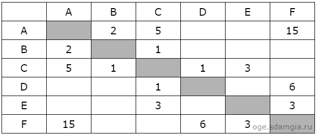 Между населенными пунктами A, B, C, D, E, F построены дороги, протяженность которых в (километрах) приведена в таблице.