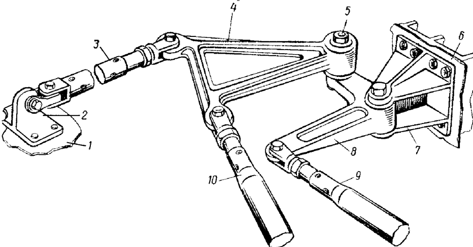 - 2— сектор левой педали, 5— соединительная тяга правой и левой педалей,12— тандеры.