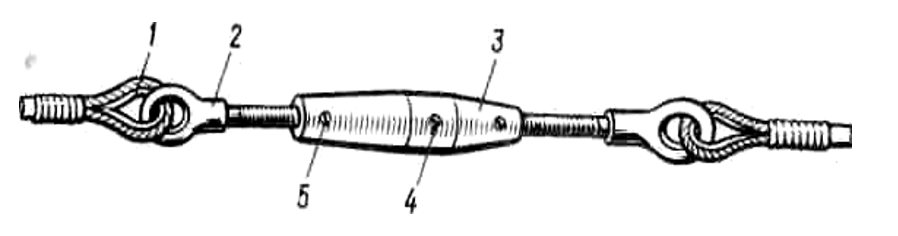 - 1 — коуш; 2 — ушковый болт; 3 — муфта; 4 — отверстие для вращения муфты; 5 — контрольное отверстие
