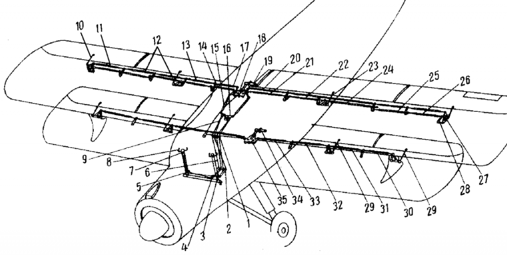 - Зависание элеронов на угол 16° при отклонении закрылков осуществляется поворотом качалок зависания 4, связанных тягами 10 отклонения закрылков.