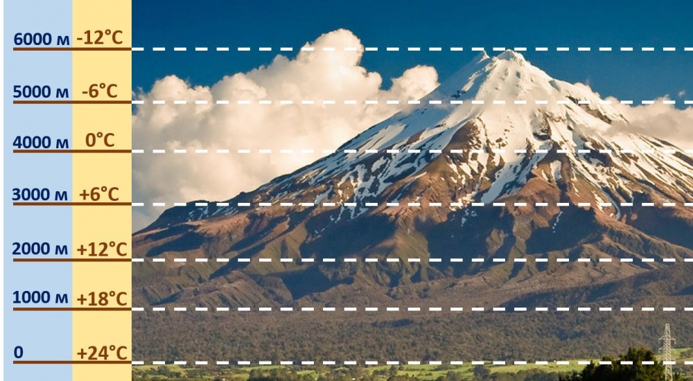 Посмотрите на рисунок и определите, какая разница будет в температуре воздуха у подножия гор( 0 м над уровнем моря) и на их вершине (6000 м над уровнем моря).
