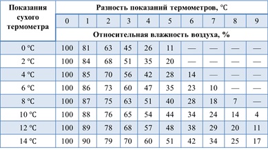 Сухой термометр психрометра показывает 14 оС, а влажный термометр показывает 9 оС. Какова относительная влажность воздуха (в %)?
