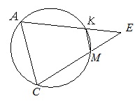 8. В окружность вписан четырехугольник АКМС. Прямые, на которых лежат стороны АК и МС, пересекаются в точке Е. Определите АС, если КМ = 10, СЕ = 14, КЕ = 7.