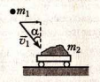 В неподвижную тележку с песком влетает ядро массой 2 кг. Масса тележки вместе с песком 18 кг. Скорость ядра 120 м/с. Угол \(\alpha\) между направлением скорости и отвесной линией (изображена пунктиром) составляет 30 градусов. Опредилите скорость движения тележки после того как ядро застрянет в песке. Силой трения между колесами тележки и землей пренебречь.