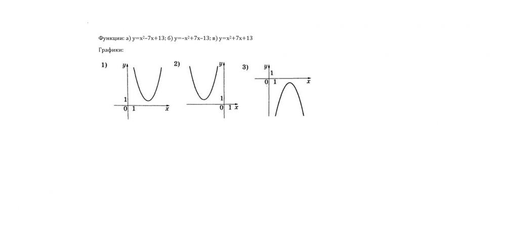 3. На рисунках изображены графики функций вида y=ax2+bx+c. Установите соответствие между графиками функций и знаками коэффициентов a и c. В ответе запишите цифры в порядке соответствующим графикам А, Б, В соответственно, например 123 означает А-1, Б-2, В-3.