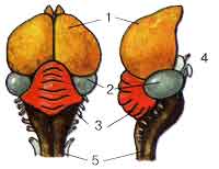 - В головном мозге земноводных имеются пять отделов, но передний мозг развит хуже, чем у рыб