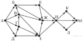 На рисунке представлена схема дорог, связывающих города А, Б, В, Г, Д, Е, Ж, З, И, К, Л, М. По каждой дороге можно двигаться только в одном направлении, указанном стрелкой. Сколько существует различных путей из города А в город М, проходящих через город Ж?