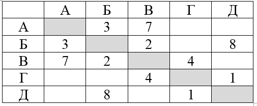Между населёнными пунктами A, B, C, D, E, F построены дороги, протяжённость которых (в километрах) приведена в таблице. Определите длину кратчайшего пути между пунктами A и F. Передвигаться можно только по дорогам, указанным в таблице.