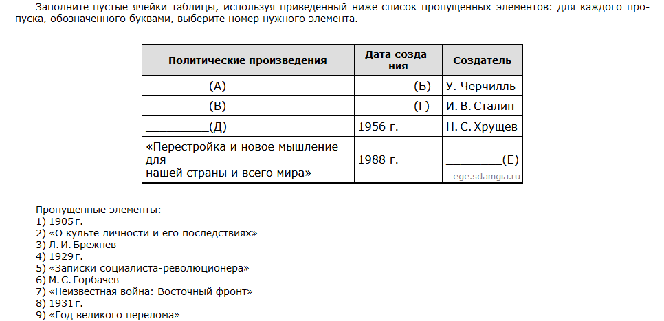 | 1) СЭВ | 2) СССР | 3) ГКЧП | 4) ОВД | 5) СНГ |