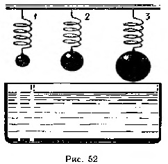 1. К одинаковым пружинам подвешены шарики равной массы, но разного объема. Снизу к шарикам подносят сосуд с водой и поднимают его до такого уровня, пока шарики полностью погрузятся в воду (рис. 52).