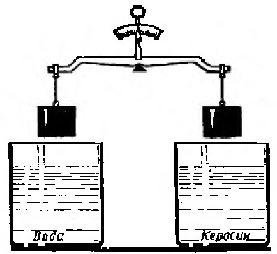 2. К коромыслу рычажных весов подвешены два одинаковых груза (рис. ). Нарушится ли равновесие весов, если одну гирю опустить в воду. а другую в керосин?