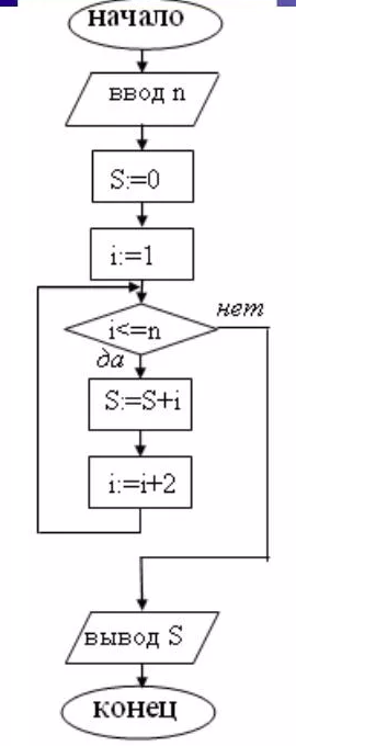 Дана блок-схема алгоритма. Чему будет равно S после выполнения алгоритма при n=3. Запишите полученное число.