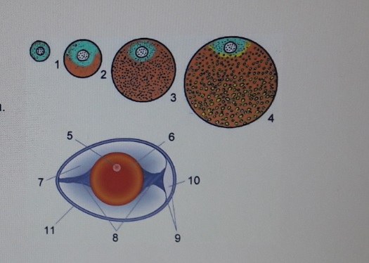 Зрелый фолликул, желтое тело и белое тело обозначены цифрами