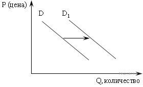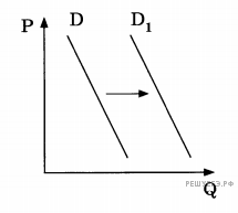На рисунке отражена ситуация на рынке товаров для активного отдыха: линия спроса D пере-местилась в новое положение D1 (P – цена товара, Q – количество товара). Это перемещение может быть связано, прежде всего, с (со)