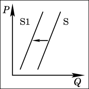 На рисунке отражена ситуация на рынке зерна: линия предложения S переместилась в новое положение S1 (P – цена товара, Q – количество товара). Это перемещение может быть связано, прежде всего, с (со)