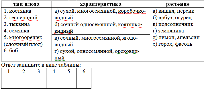 Установите соответствие между типом плода, его характеристикой и растением, у которого этот плод образуется. Ответ запишите в виде ЦИФРА - БУКВА - БУКВА (1РТ)