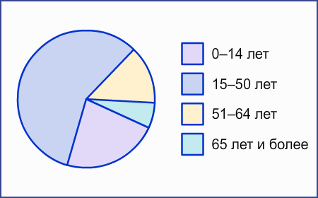 На диаграмме представлен возрастной состав населения одной из азиатских стран. По диаграмме определите, население какого возраста преобладает.