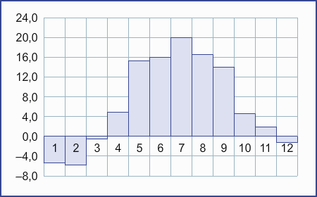 На рисунке показана среднемесячная температура в поселке Котово в 2003 году. По горизонтали указываются месяцы, а по вертикали – температура в градусах Цельсия. По приведенным данным определите, сколько месяцев температура была выше 10 градусов.