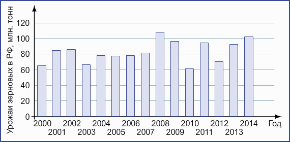 На диаграмме представлены данные об урожае зерновых в РФ с 2000 по 2014 годы. Какой год был наименее урожайным за указанный период?