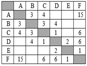 Между населёнными пунктами A, B, C, D, E, F построены дороги, протяжённость которых (в километрах) приведена в таблице. Определите длину кратчайшего пути между пунктами D и F. Передвигаться можно только по дорогам, протяжённость которых указана в таблице.