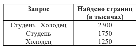 В таблице приведены запросы и количество найденных по ним страниц некоторого сегмента сети Интернет. Считается, что все запросы выполнялись практически одновременно, так что набор страниц, содержащих все искомые слова, не изменялся за время выполнения запросов.