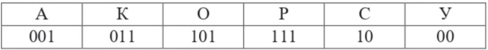 В этом сообщении зашифрован пароль - последовательность русских букв. В пароле использовались только буквы А, К, О, Р, С, У; каждая буква кодировалась двоичным словом по такой таблице: