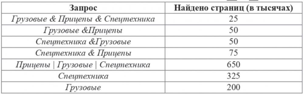 Какое количество страниц (в тысячах) будет найдено по запросу Прицепы? Считается, что все запросы выполнялись практически одновременно, так что набор страниц, содержащих все искомые слова, не изменялся за время выполнения запросов.