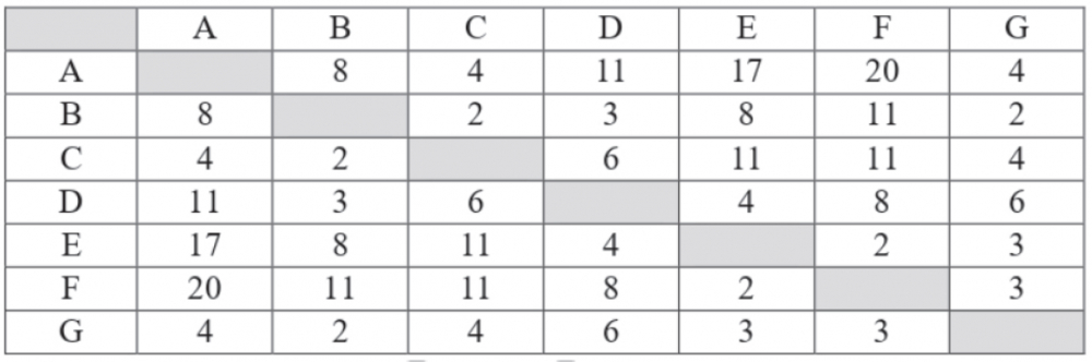 4. Между населёнными пунктами А, В, C, D, E, F, G построены дороги, протяжённость которых (в километрах) приведена в таблице.