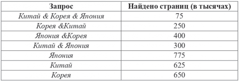 Какое количество страниц (в тысячах) будет найдено по запросу Япония | Корея | Китай ? Считается, что все запросы выполнялись практически одновременно, так что набор страниц, содержащих все искомые слова, не изменялся за время выполнения запросов.