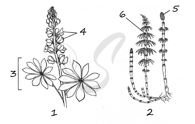 Установите соответствие между характеристиками и объектами, относящимися к разным отделам растений, обозначенными на рисунке выше цифрами 1, 2