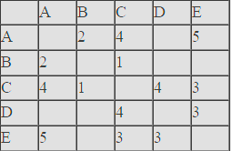 Между населёнными пунктами A, B, C, D, E построены дороги, протяжённость которых (в километрах) приведена в таблице. |