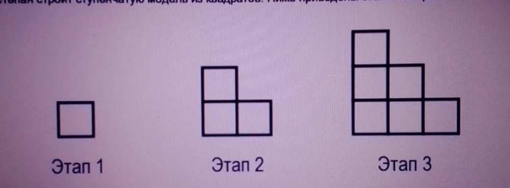 Степан строит ступенчатую модель из квадратов. Ниже приведены этапы построения.